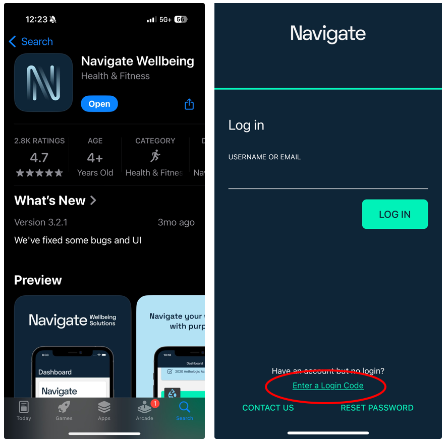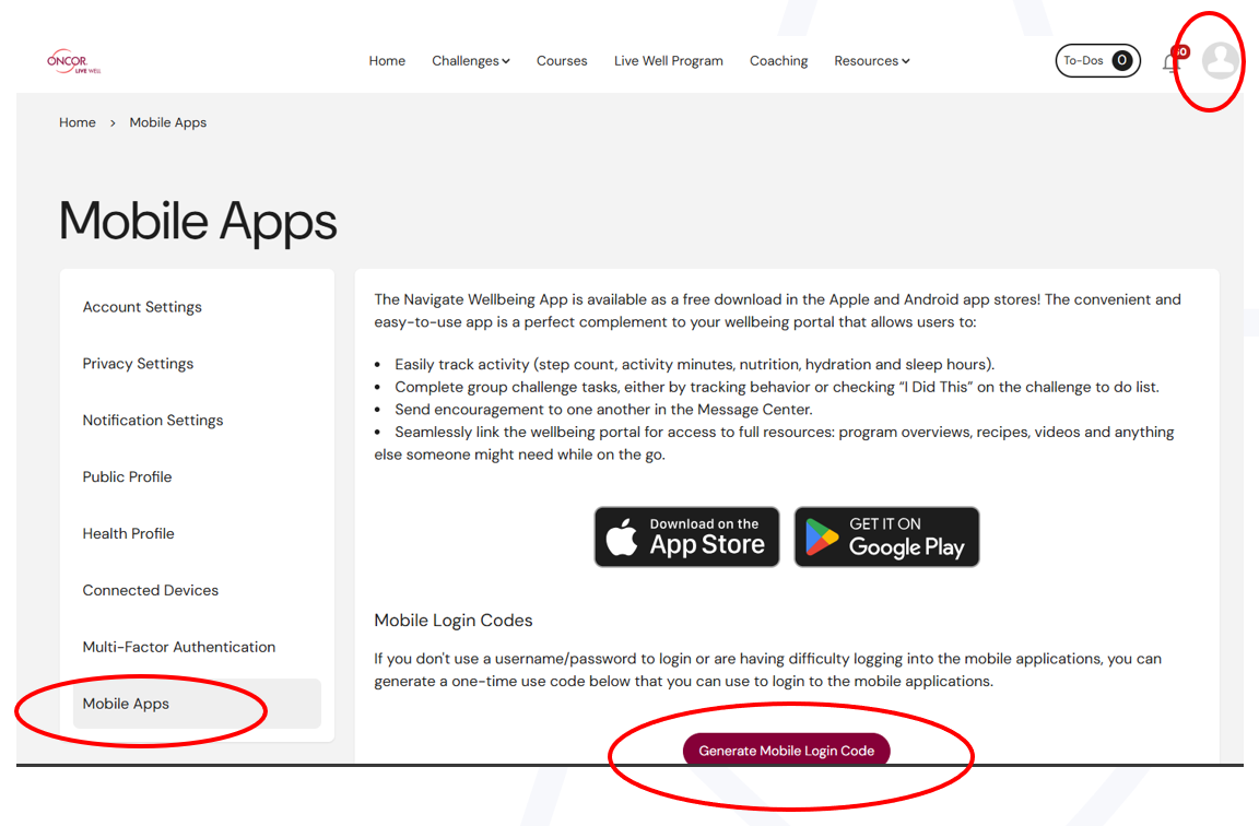 Go to Navigate online through the intranet live well incentives tab. Once there, click on account settings by hovering over your profile icon. Click on Mobile app and generate a login code to enter into your app by clicking on the red button.